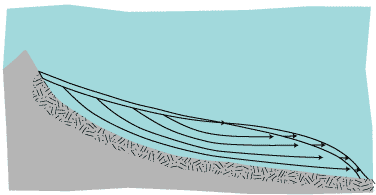Nu kan vi till slut sammanföra vad vi vet om både den vertikala isrörelsen och hur den horisontella rörelsen varierar längs glaciären. I de översta delarna är den vertikala hastigheten stor och nedåtriktad (vi definierar nedåt med ett negativt tal) medan den horisontella är liten. Allteftersom vi närmar oss jämviktslinjen ökar den horisontella rörelsen medan den vertikala närmar sig noll. Nedanför jämviktslinjen minskar den horisontella hastigheten mot låga värden vid glaciärfronten medan den vertikala hastigheten går från noll till höga uppåtriktade (positiva) värden.