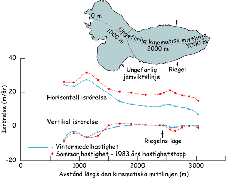 Det resonemang vi nu genomfört ger oss en generell bild av vad vi kan förvänta oss när det gäller hastighetsfördelningen från glaciärens övre delar till dess nedre. Isrörelsen ökar alltså från glaciärens översta delar till ett maximum vid jämviktslinjen för att sedan avta när vi närmar oss glaciärens front. Resonemanget är förenklat men ger trots allt en bra bild av glaciärernas rumsliga variation i isrörelse. Vi kan åskådliggöra detta genom att jämföra med en verklig glaciär, Storglaciären.
