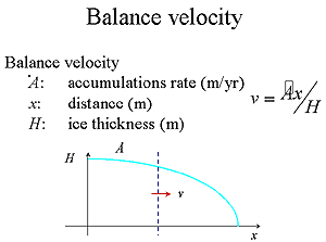 Nettotillskottet av massa, mätt i volym massa per år, kan beräknas genom att man mäter djupet av snö som tillkommer per år (bNm/år) och multiplicerar detta med ytan ovanför snittet(Aa m2), (bN*Aa m3/år). Denna snömassa skall transporteras genom tvärsnittet. Tvärsnittet har en tvärsnittsarea (Atam2) som kan mätas, och snötransporten genom tvärsnittet sker med en medelrörelse(vam/år). Detta betyder att vi kan beräkna glaciärens medelhastighet genom tvärsnittet genom att dividera massan som tillkommer per år (bN*Aa)med tvärsnittsarea vid a (Ata).
