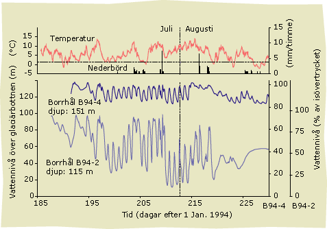 Vattentryck uppmätt vid bottnen av glaciären syns som blå kurvor. Till vänster anges det tryck i m vatten som kurvorna motsvarar, till höger anges detta tryck i % av istrycket (100% betyder att isen kan flyta då trycket är lika med isens tryck). Överst i figuren finns de meteorologiska parametrar som styr vattentemperaturen (rött) och nederbörden (svarta staplar). Vattentrycket har en mycket utpräglad dygnsvariation och det går att se att topparna styrs av temperaturen (d.v.s. den smältning som temperaturen orsakar samt den nederbörd som faller.