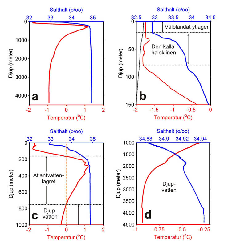 Temperaturen är mycket nära fryspunkten närmast under isen och fortsätter att vara nära fryspunkten ända ner till ca 100 meter, samtidigt som salthalten stiger mot djupet. Denna kalla vattenmassa, med relativt konstant temperatur och ökande salthalt med djupet, finns över stora delar av bassängen är unik för Arktiska Oceanen. Den brukar benämnas den ”kalla haloklinen”. Med haloklin menar man ett lager med extra stor salthaltsförändring med djupet jämfört med övriga delar av vattenkolumnen.